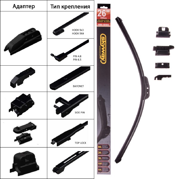 Щетка стеклоочистителя бескаркасная 65см/26" SKYWAY 1шт. 5 адаптеров - бескаркасный щетки с 5 адаптерами подходят для любого автомобиля и обеспечивают равномерное очищение всей поверхности стекла. Благодаря технологическому усовершенствованию щетки SKYWAY способны удалять даже самые мелкие частицы воды. Натуральный каучук, из которого произведены щетки, и графитовое напыление позволяют значительно снизить уровень шума, а также увеличивают срок службы. Резина щеток остается эластичной в разных погодных условиях и под действием реагентов. Щетка плотно прилегает к стеклу даже на большой скорости, надежно защищая его от загрязнений.