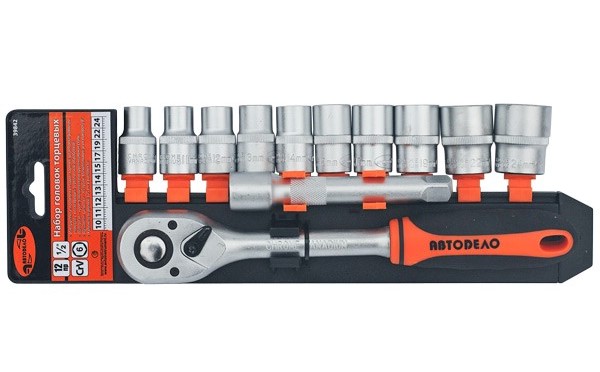Набор головок торцевых 12предметов АвтоDело 1/2" 10-24 мм с трещоткой и удлинителем - набор укомплектован головками торцевыми, удлинителем и флажковой трещоткой. Инструмент изготовлен из хром-ванадиевой инструментальной стали, закалён и зажищён от коррозии хромовым защитно-декоративным покрытием. Набор упакован в пластиковый держатель . Ключи и головки имеют стандартные присоединительные квадраты 1/2 .